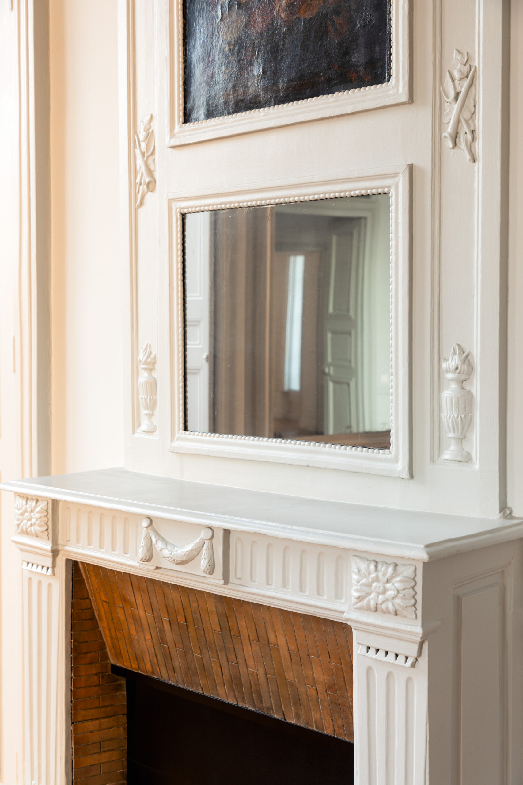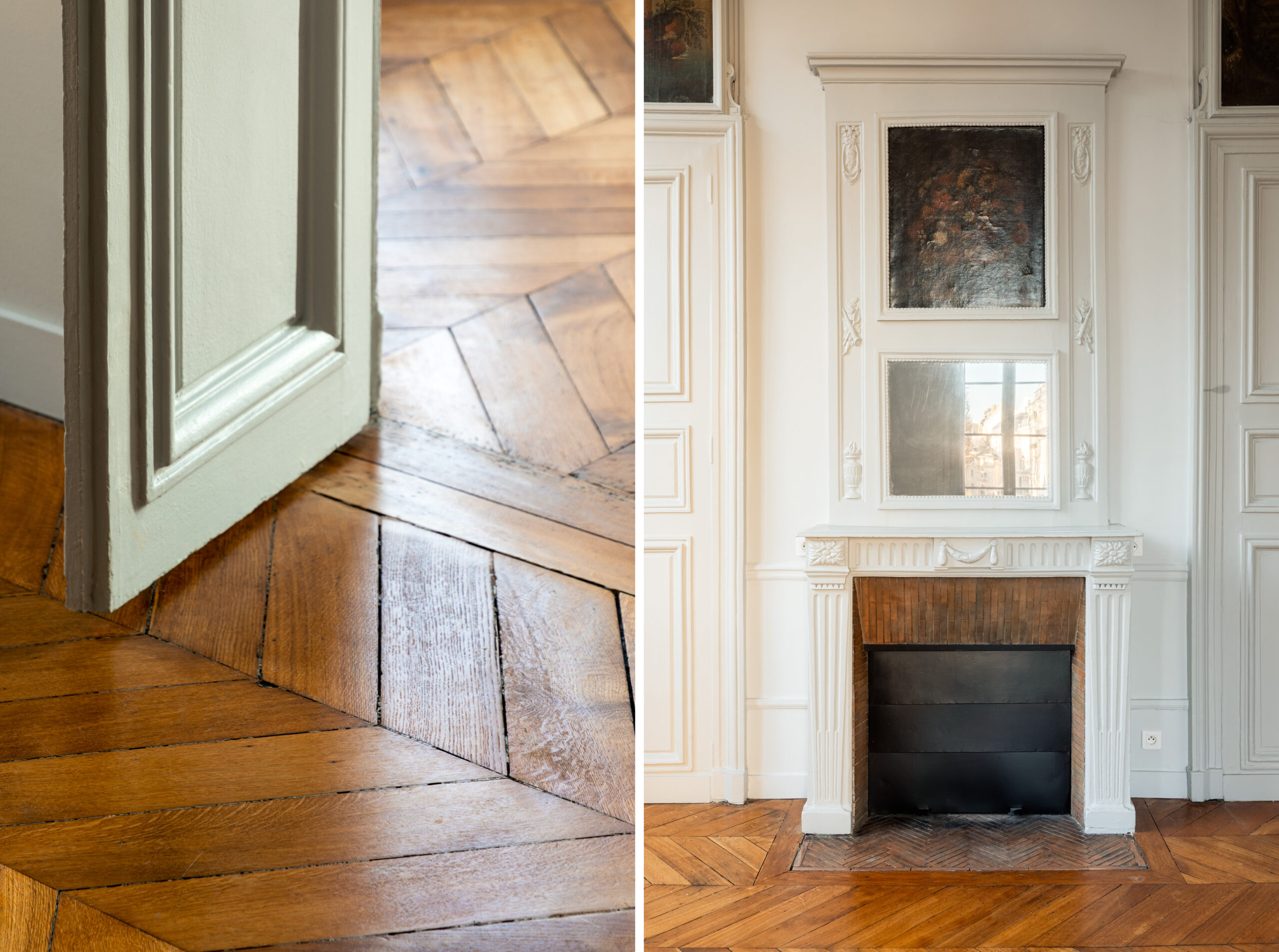 Salon d’angle avec plus de 4,20 m sous plafond. Parquet, moulures, cheminée. Panneaux décoratifs peints.