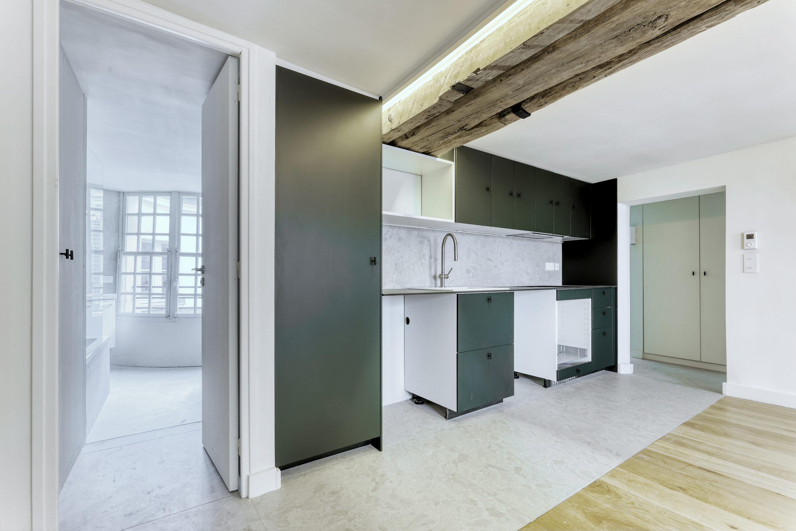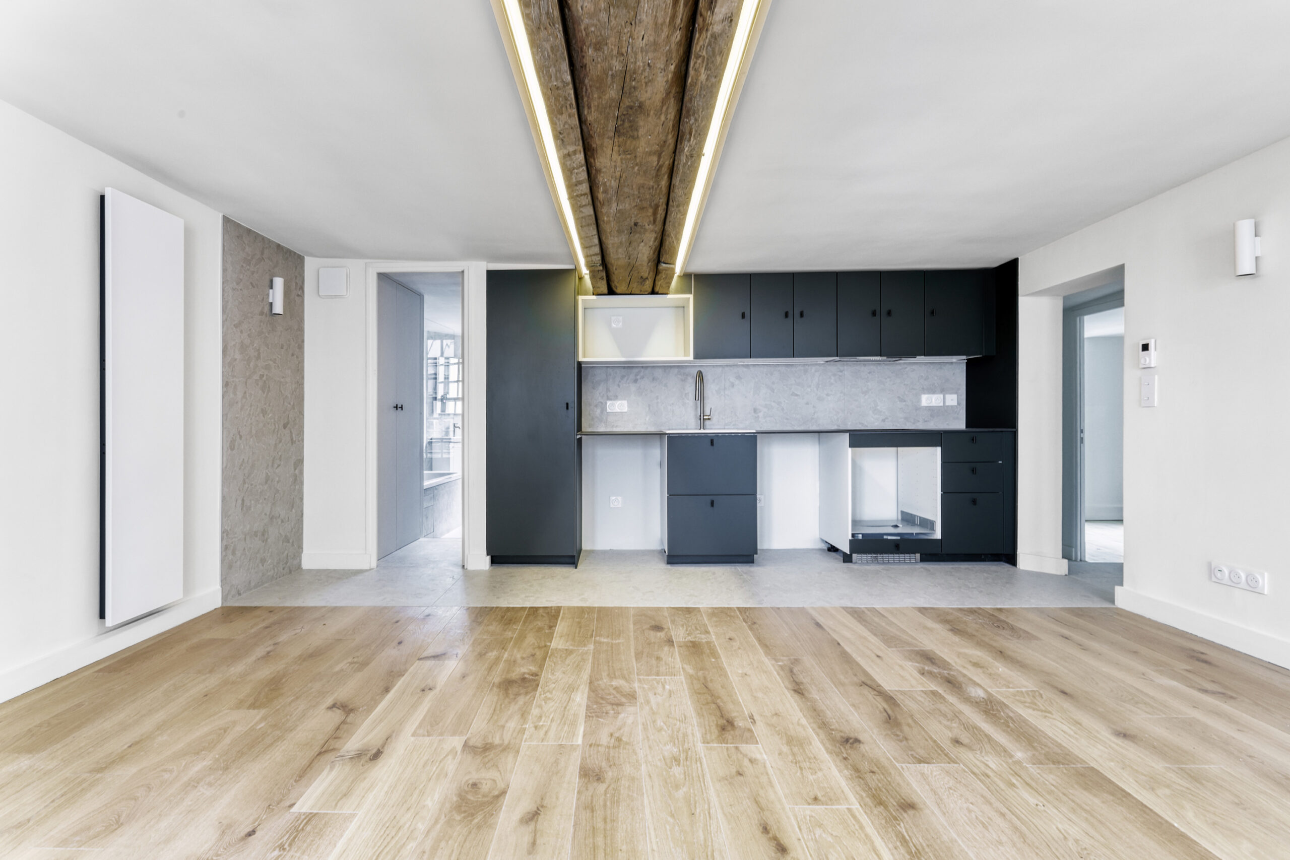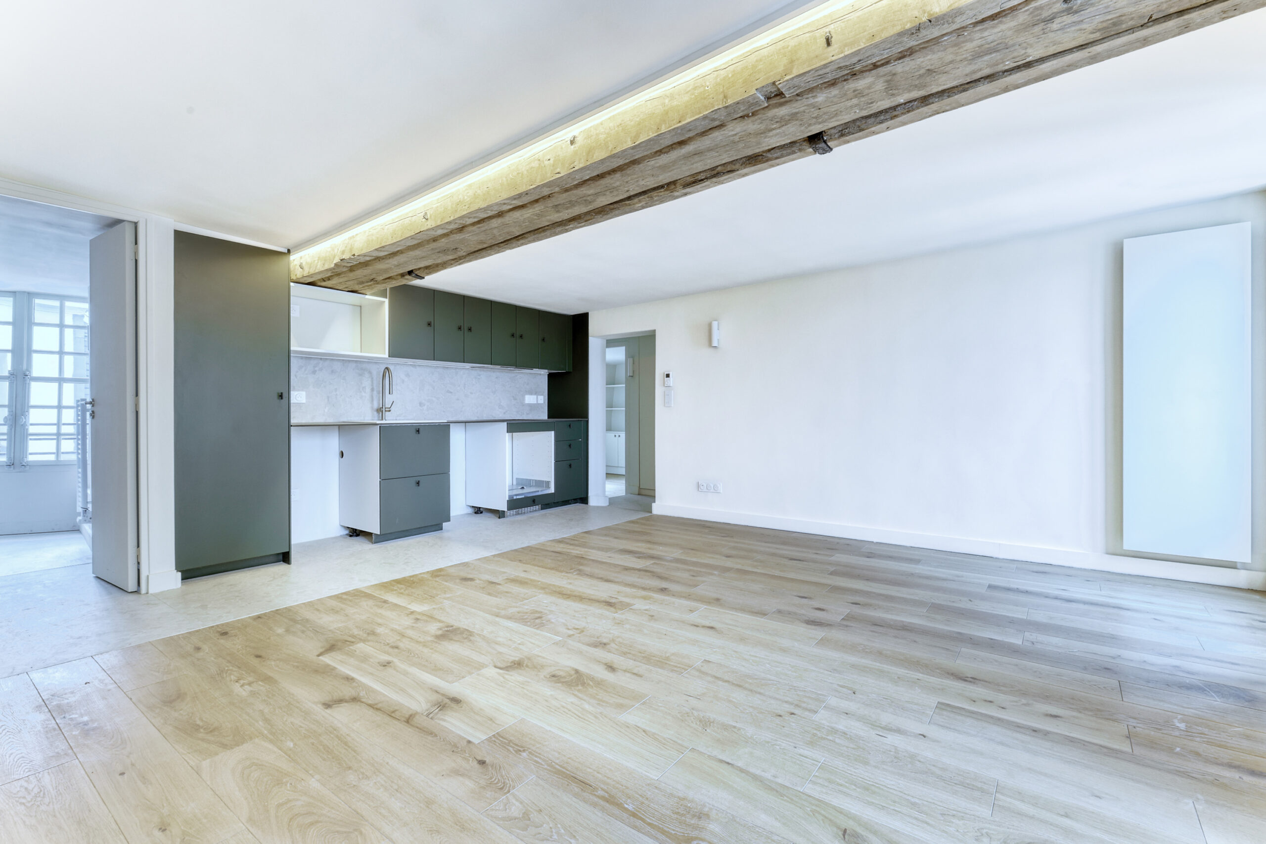 Séjour d’angle avec cuisine ouverte aménagée non équipée